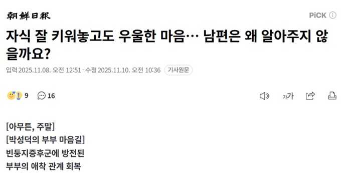조선일보, [박성덕의 부부마음길] 자식 잘 키워놓고도 우울한 마음.... 남편은 왜 알아주지 않을까요? | ![]() |