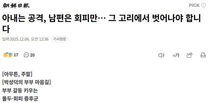 조선일보, [박성덕의 부부마음길] 아내는 공격 남편은 회피만... 그 고리에서 벗어나야 합니다. | ![]() |